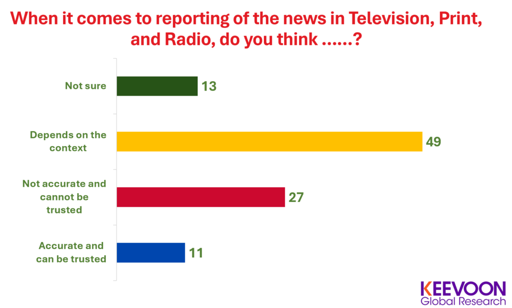 Despite the crucial role of media in a democratic society, the poll reveals a striking lack of trust in Moldovan media outlets. Only 11% of respondents believe that the news reported on television, in print, and on the radio is accurate and trustworthy. This low level of confidence highlights the need for significant reforms in the media sector to ensure impartiality, transparency, and reliability in news reporting. The scepticism towards media accuracy is fuelled by perceptions of bias, sensationalism, and government interference. Many Moldovans feel that the media landscape is dominated by a few powerful interests, which compromises the objectivity and independence of news coverage. To rebuild trust, there is a call for more rigorous journalistic standards, greater diversity of media ownership, and stronger protections for journalists to report freely and without fear of retribution. Ensuring the credibility of the media is essential for informed public discourse and the health of democracy in Moldova.
